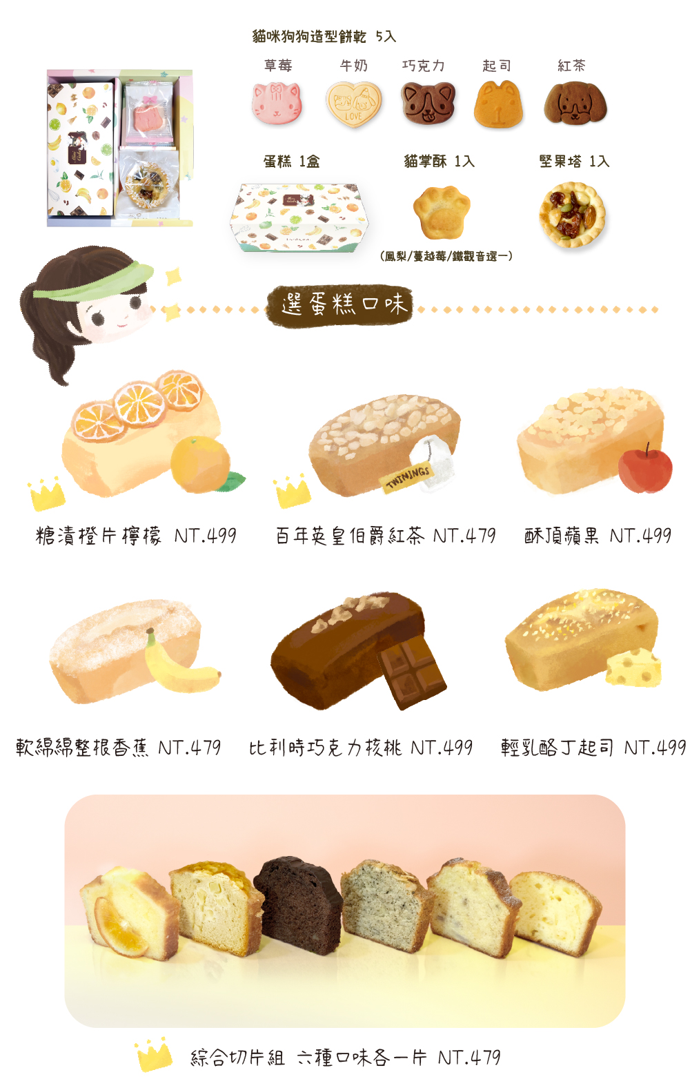 - 磅蛋糕1盒 + 堅果塔1入 + 貓掌酥1入(鳳梨、蔓越莓、鐵觀音抹茶3選1) + 造型餅乾5片(5種口味平均)