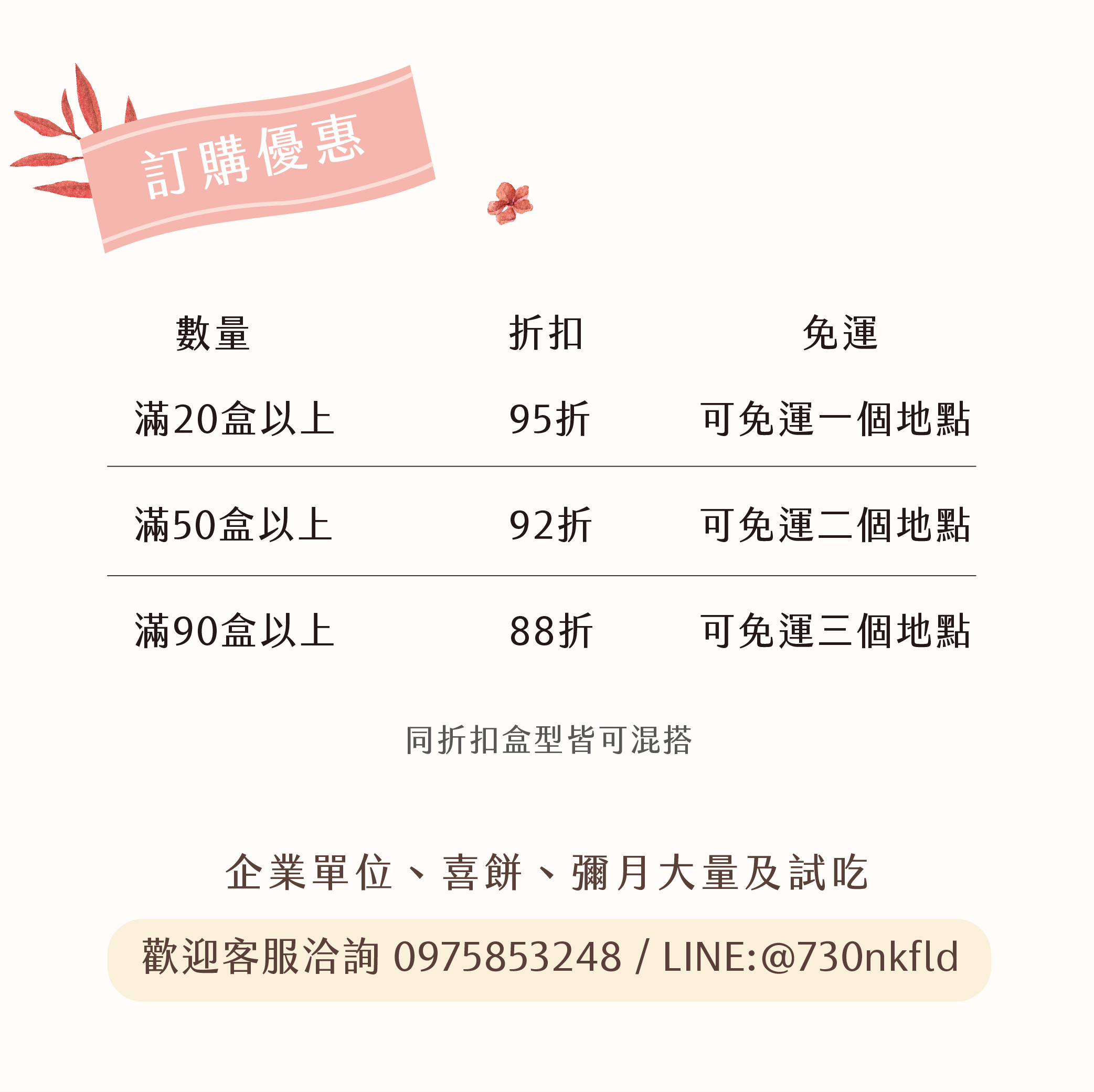 | 滿50盒以上 | 每盒折扣92折 | 可免運二個地點 |