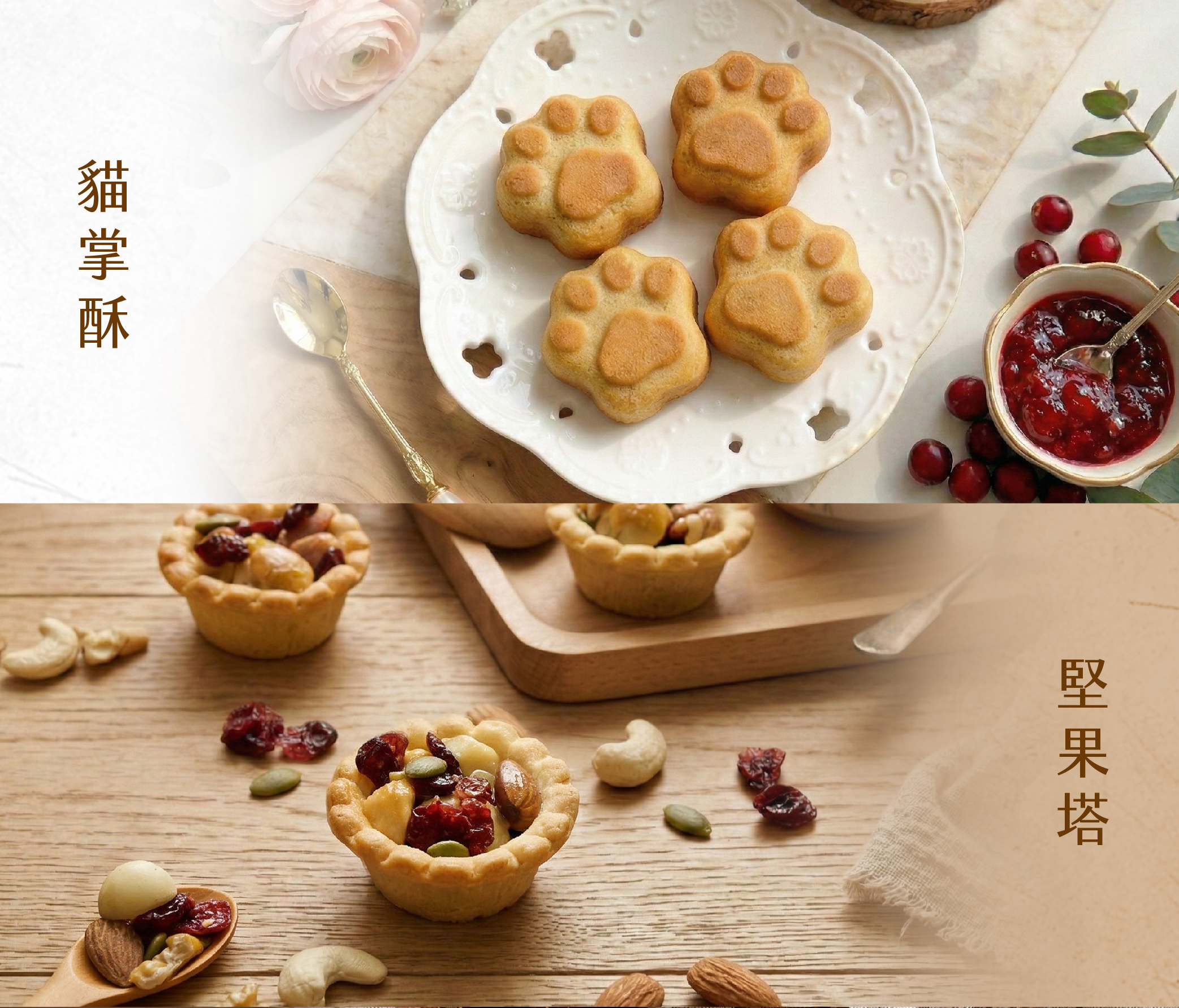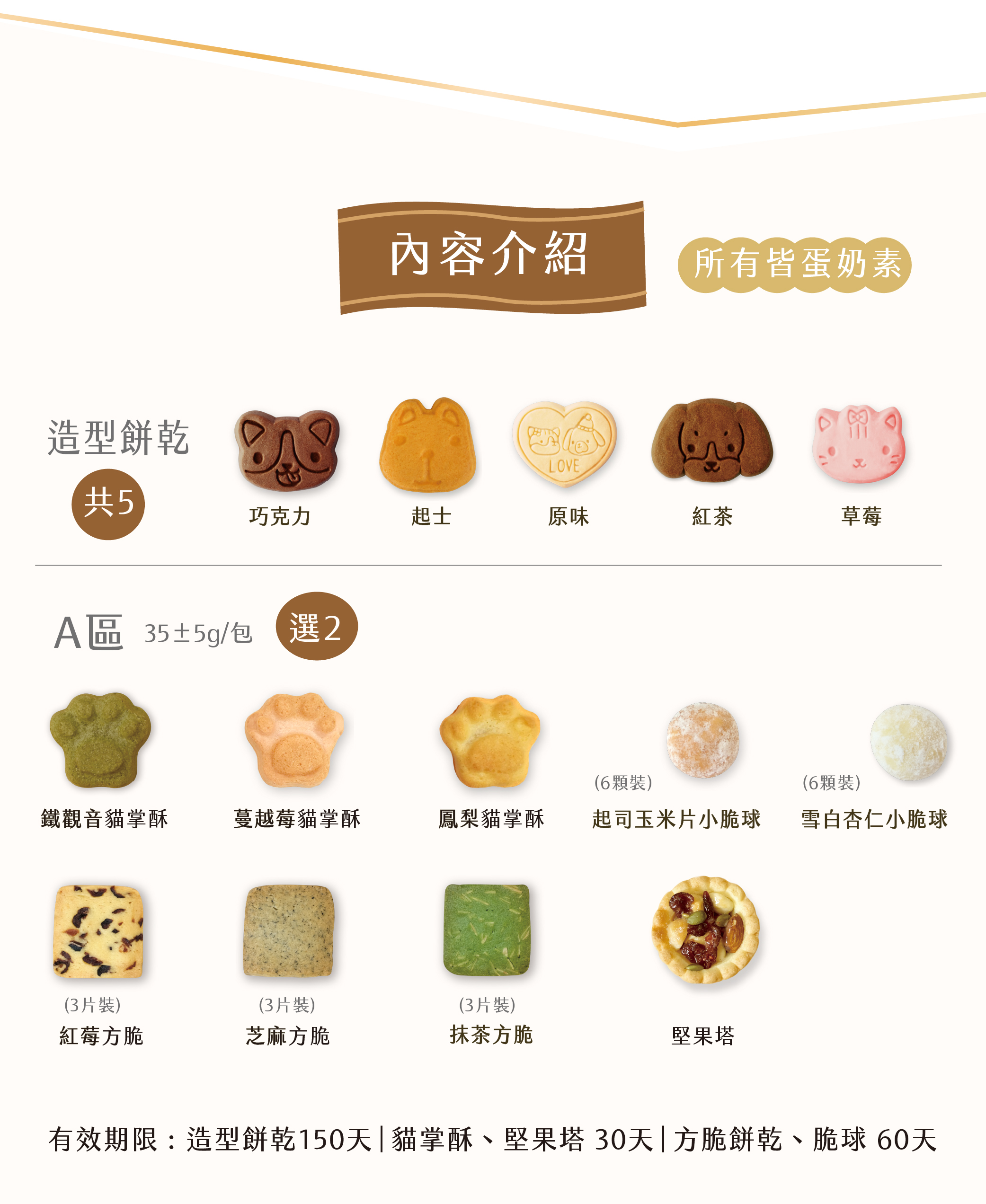 - 保存期限:堅果塔30天、貓掌酥30天、脆球60天、方脆餅乾60天、造型餅乾150天